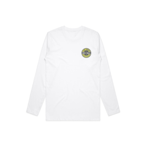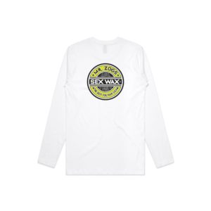 Impresión del logotipo de Sexwax en colores degradados con diseño original de letras a mano en la parte posterior. Mismo diseño más pequeño en el frente en la posición de bolsillo. Ajuste holgado 6 oz. Camiseta de manga larga 100% algodón.
